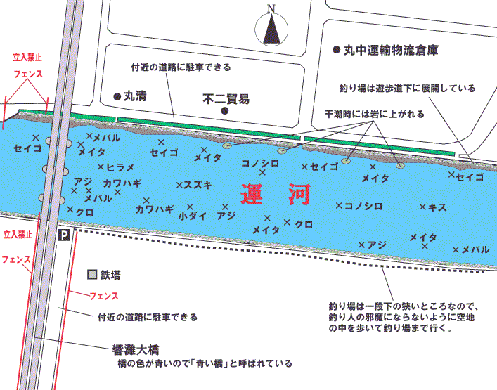 響灘埋立地は運河で南北に分断され、響灘大橋(通称:青い橋)を使って車で行き来している。埋立地を東西に貫通し、両サイドは響灘と直結しているので潮通しが良く、魚種も豊富なところだ。釣り場は青い橋の右手(東側)に集中している。というよりも左側一帯にはフェンスが張られ、両岸ともに立ち入りが禁止となっている。北九州を代表する人気の釣り場で、それなりの実績もあることからフカセ釣り、投げ釣り、ルアー、アジング、サビキ釣り、チョイ投げの釣り人が四季を問わず訪れるところである。