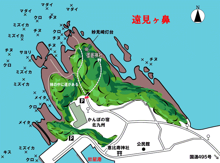 遠見ヶ鼻は岩屋港の北側に突きだした地磯である。灯台の名前をとって妙見崎とも呼ばれ、北九州を代表する地磯のひとつである。底根が荒く、縦横に切れ込んだ無数の段状の入江が絶好の棲みかとなり、周年フカセ釣りの人たちでにぎわっている。釣り場も広く、30人以上を収容することができるので、ポイントさえ選ばなければ遅い時間からの竿出しも可能だ。