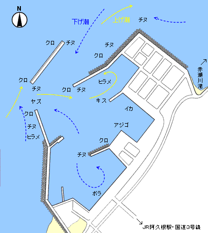 甑島への出航地である阿久根港は釣場も広く、魚影魚種とも豊富である。長い波止は落とし込みのメッカとなっている。左手の波止で下げ潮を狙うと釣果が期待できる。5・6月には50cm級のチヌも出る。