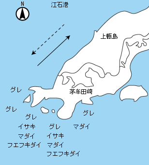 上甑島最南端の岬。北西の風がつよくて他の釣場に乗れない時の予備的ポイントだが、グレはよく釣れる。夏から秋にかけては遠投カゴ釣りマダイが狙える。