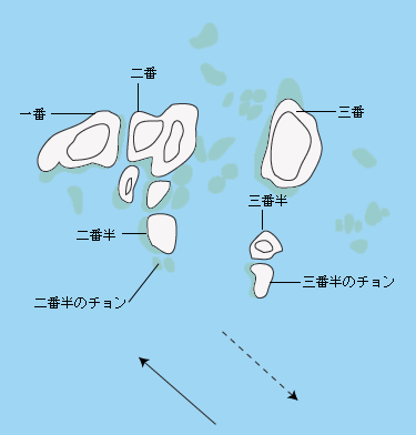 クロ・イシダイの数釣りの実績が多い。潮は複雑で流れが速いので小潮から中潮がよい。水深5〜15m程度。海底はゴロタ石で沈み瀬も多く、根がかりには注意したい。西の一番と東の三番は上物・底物ともよい。二番は上げ潮がよく底物も狙える。