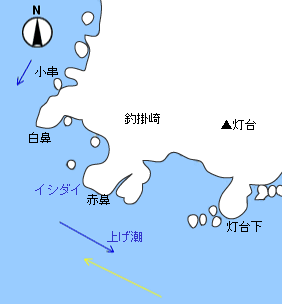 手打湾の西に位置する下甑島最南端の岬。水深約20mと深く、底根も複雑なので中潮回りが狙い目。白鼻から北向き、赤鼻から沖向き、灯台下から南東の沈み瀬で底物がヒットする。シーズン初期のイシダイ乗っこみから上物・底物ともコンスタントに釣れる。夜釣りではオナガ・イサキ・フエフキ・アラが楽しめる。