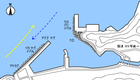 クロはミロクガニが流れてくる6月が中心。上げ潮のときは北側に突きだした波止からテトラ側を釣る。下げ潮では南端で湾の入り口を狙う。