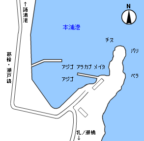 港の東側、野島に面した地磯でのチヌ狙いで7・8月には40cm級が釣れる。水深は8m程度。どの魚種も6月〜9月までがシーズンで夏の釣り場である。
