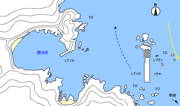 沖波止では、湾内に入る下げ潮で地向きに釣ってミズイカとアジゴ。右手の早崎方面へ流れる上げ潮のときにクロ30cm級やイサキ40cm級があたってくる。荒れ気味のときには地磯の汐吹きからクロがあたる。