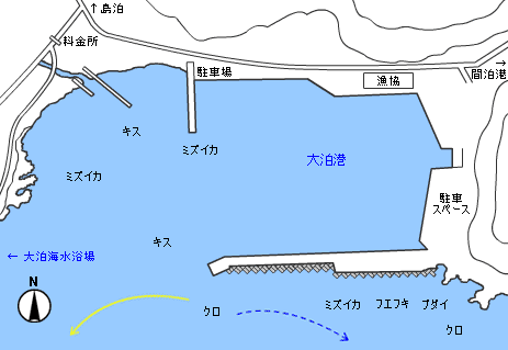 県道68号線から佐多岬展望台への入り口にあたる。南向きに開けており、潮は東西に流れるので両潮とも釣りやすい。4月末ころから魚種も豊富になるが、クロのシーズンは秋口から春先まで。波止の東側の地磯から遠投カゴ釣りで狙う。夏場にはフエフキダイの大型も出る。