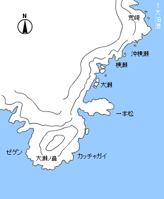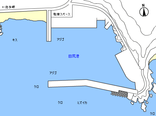 【 田尻港東側 】 田尻港の東側に地磯のポイントが連続しており、北西の風がつよい日にはたのもしい釣り場となる。クチブトの良型が釣れる有名ポイントでもある。この辺りのクロはなかなか浮いてこないので、ウキ下を竿1本から2本とやや深めで攻めるといい。 田尻港の西側にも大輪島、ツブキシタなどのポイントがあり、オナガの釣れる場所である。 先端の大輪島、裏瀬尻は大型のメッカなので大きめの仕掛けで臨みたい。