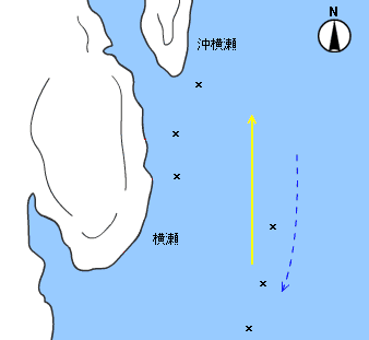 【 横瀬 】 横瀬辺りは乗っ込みが始まる一級ポイントである。払い出しと沖の潮目がぶつかる場所を攻めるが、磯際で大物があたることもある。 |