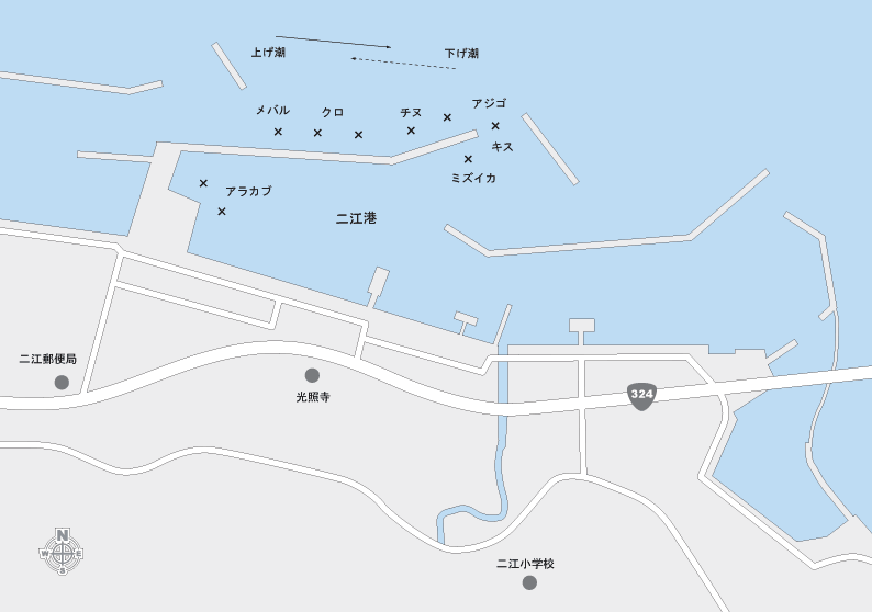 大型の港だけあって対象魚は数多く、チヌ、クロ、アジゴ、キス、メバル、アラカブと多彩。落とし込みで大型のチヌを狙うのが特に良い。