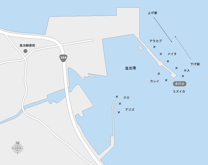 波止は海面から高くなっているので子供連れの釣行には向かない。中潮が狙い目。春から夏にかけての乗っ込み期に赤灯台付近から狙うと良い。良型のチヌも期待できる。