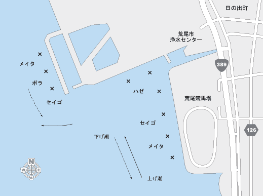 競馬場付近は足場が良く竿出しもやりやすいので、ファミリーフィッシングにお勧めの釣場である。満潮前後が狙い目で、投げ釣りは夏にメイタやセイゴ、冬にカレイやハゼを狙ってみよう。夜釣りのほうが釣果が期待できる。