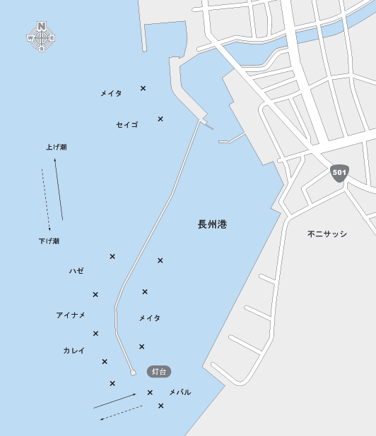 波止が高いが足場は良いので、ファミリーフィッシングを楽しむのも良いだろう。中潮から大潮回りが狙い目で、セイゴやメイタが釣れる。釣果が期待できるのは夏から秋にかけてである。