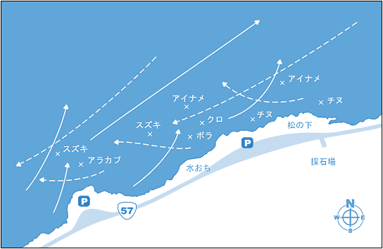 磯釣りの名ポイントである。松の下は比較的足場が良く、数人の竿出しができる。朝夕まずめはチヌを、夜釣りはスズキやメバルを狙ってみよう。水おちは満潮から五分下げに、前方の大きな沈み瀬を狙うと良い。
