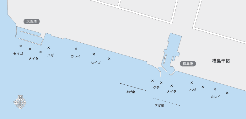 横島港を中心に両岸約1kmの沿岸から釣りが楽しめる広大な釣りスポットである。足場は良いが海面からやや高いので少し注意が必要。横島港からは夏のサビキ釣りやウキ釣りでセイゴを狙ってみよう。横島港以外の範囲では中潮から大潮の満潮前後を狙うと良いだろう。夜の投げ釣りでグチやメイタの釣果が期待できる。