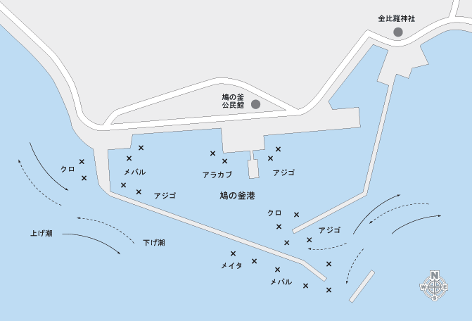 足場が良く、ファミリーフィッシングにお勧めの釣場である。東側の波止よりは西側の波止から狙うとより釣果が期待できるだろう。中潮が狙い目。