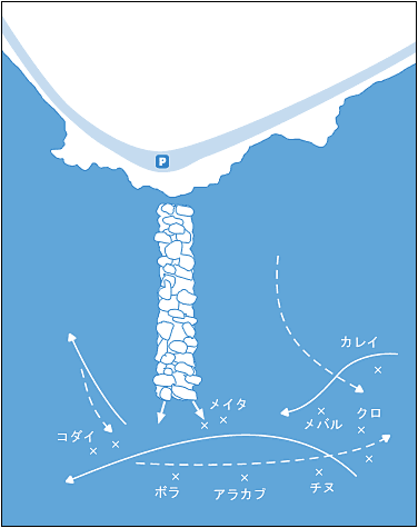 足場が悪くさらに低いため十分注意して釣行すること。中潮が狙い目でメイタやクロが釣れる。