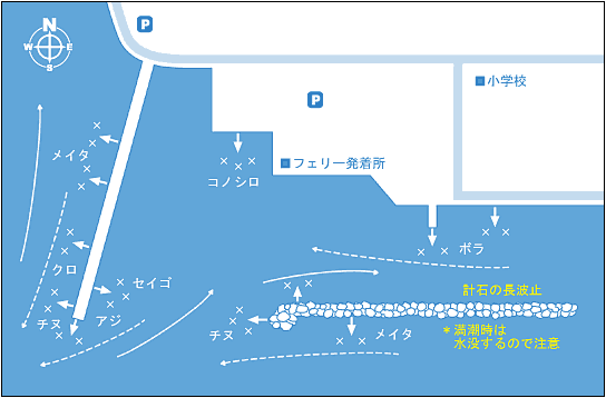 中潮が狙い目。夏から秋にかけては下げ潮、冬は上げ潮に合わせて狙うとメイタやチヌが釣れる。
