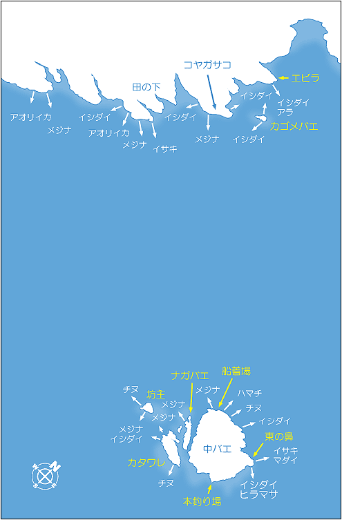 イサキ、マダイの好ポイントで、底物、上物ともに良い。瀬が大きく夜釣りも危険が少ない。カタワレからのメジナ、チヌが良い。