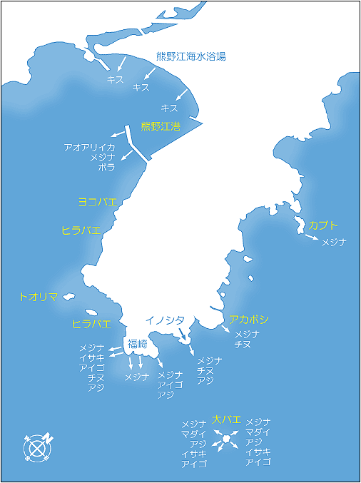 一年を通じて人気が高く、メジナの大物、マダイやチヌの良型が出る一級ポイントである。福崎は沖に出て行く潮が良く、大バエは潮により表より裏が良いことがある。イサキ、マダイは遠投で深めを流すようにすると良い。