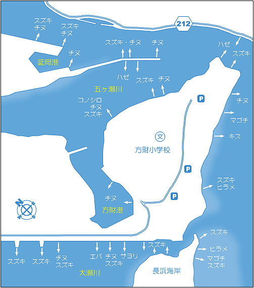 左岸で釣果が期待できる。方財、長浜海岸は一年を通じて釣果が期待できるが、五ヶ瀬川の流れしだいでポイントが変化してくるので見きわめて釣行したい。