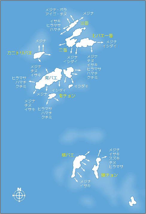 メジナの好ポイントで、数、型ともに期待できる。夏から秋にかけての夜釣りで7キロクラスのフエフキダイが狙える。両バエの間は瀬が多いので取り込み時は注意すること。