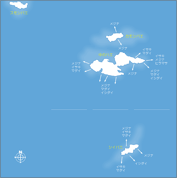 ・中のハエ 北浦きっての名礁。水深は15ヒロとやや深めで潮は速く、魚種は豊富で魚影も濃い。クロのポイントはワレ、船着き、東の先端の3ヶ所。ワレは下り潮がよい。船着けはワンドも狙える。先端は潮が速いときは避けたほうがいいが、上り潮が巻き込めば裏側でおもしろい。ハマチは10月以降に大当たりすることがある。