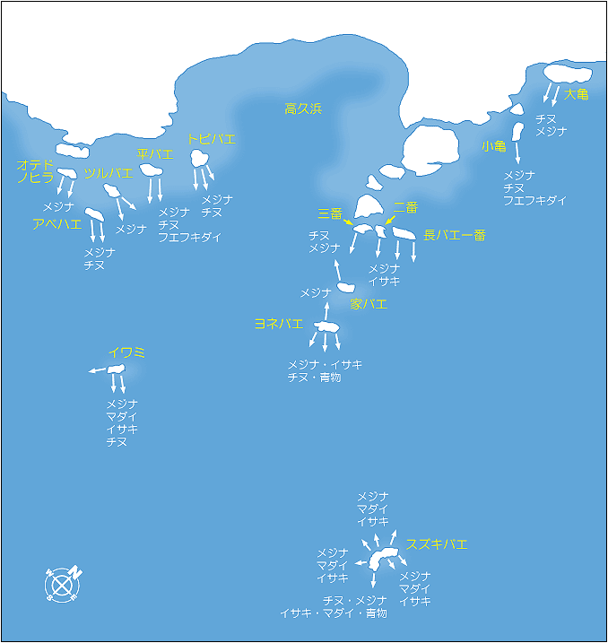 メジナの好ポイントで、秋から冬にかけては数釣りが楽しめる。スズキバエのチョンはメジナの他、マダイ、チヌも狙える。しけ気味の時は船着けしてイサキ、メジナが釣れる。渡船は当番制である。