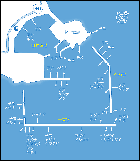 夏のシマアジを狙うと良い。夜釣りではマダイ、アジが釣れる。一文字防波堤では北側から沖に向けてイシダイ、南側はメジナがよく釣れる。