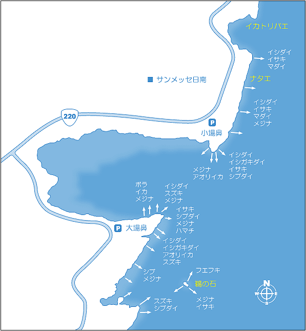 小、大場鼻はイシダイ、イシガキダイの良型が狙える好ポイントである。夏から秋にはシブダイやイサキも釣れる。ナタエはカゴ釣りでイサキ、メジナが釣れる。サラシが出る時はルアーでエバやスズキを狙うと面白い。
