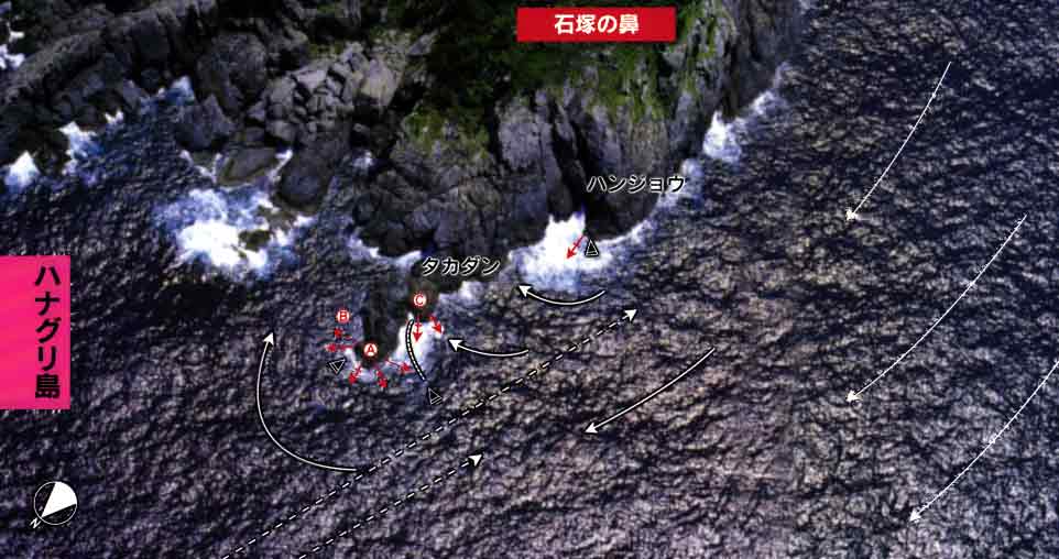 ハナグリ島の西端に位置する地磯が石塚の鼻で、ハナグリ瀬戸の西口に面している。その左手を石塚のタカダン、そのさらに先をハンジョウと呼ぶ。ハンジョウとは畳半畳分くらいの広さしかないからである。 特徴としては一帯に深いこと。足元で水深18m以上のところもある。また、上げ下げともに潮切れはよく、上物、底物共に高い実績を誇る。ただし、上物については冬場の上礁が難しい。上昇できれば、釣果はまず確実と言っていいだろう。