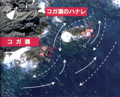 ■コガ瀬のハナレ 三つあるコガ瀬のまん中に位置し、瀬が低いことから”コガ瀬の低い方”と呼ばれている。小さいながらも上物、底物ともにポイントがあり、それぞれ実績は高い。ただし、風波に弱いのが難点で上礁は凪の日に限られる。