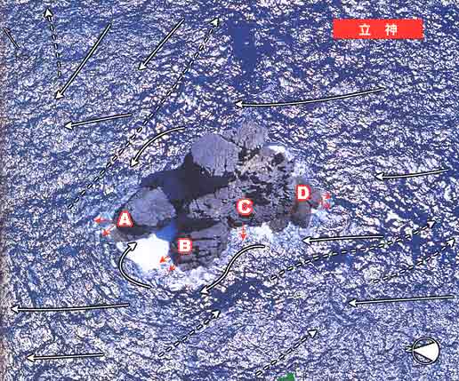 ・上物 A、Bから底物同様、上げの反転流狙いでクチブトが出る。足元〜中間距離を釣る。Dからは下げ潮がよく、女島の重箱に向かって流れる潮が理想的。中間距離でクチブトの数釣り、本流釣りでオナガが期待できる。クチブト、オナガともに型はよい。 |