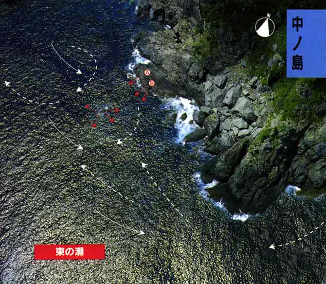 ・底物 水深二本〜二本半と全体的に浅い。Bから上げ潮を釣るが、イシダイ釣りの実績は低い。ただしクエの実績がある。 ハナレは、中ノ島を左に見る感じで二カ所から竿出しできる。下げの舞い込み潮で小型が多いが、数は期待できる。これといった海溝も無く、春は竿一本半くらいのタナで食ってくる。それぞれ一人ずつの釣座。 |