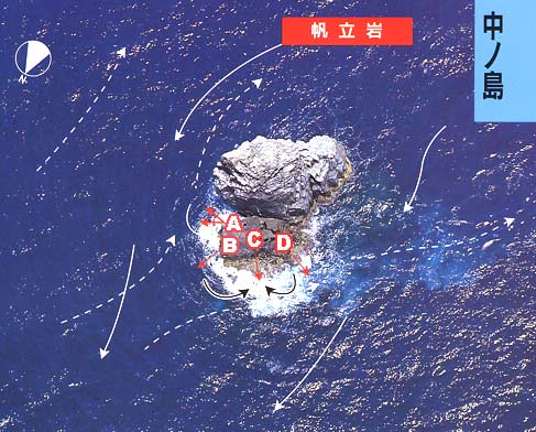 ・底物 イシダイポイントはワレのAとそのすぐ左側の二ヶ所。B、C、Dからは釣りにならない。また、狙いの潮も上物と同じように下げ潮はかなりきついので、やれるとしてもゆるんだときぐらい。もっぱら上げ潮の反転流狙いに実績がある。大型クチジロこそ少ないものの、小、中型の数釣りは可能。ときには3〜4kgがそろうこともある。水深はニ〜二本半。竿出しはAに一人、そのすぐ左に一人、合わせて二人。 |