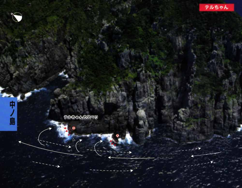 ・底物 Aは乗っ込み期のイシダイ釣りでは定評がある。水深は足元で竿二本、少し沖は竿三本あり、上げ潮の反転流を釣る。下げ潮は非常に速く、潮止まり前後しか仕掛けが止まらない。 足場はがたがたで、しかも前下がりに傾斜して入る。二人まで竿が出せる。 Bは、テルちゃんのスベリとも呼ばれている。テルちゃんと条件がほとんど同じで、釣になるのは上げの反転流のみ。朝まずめのイッパツに注意しないと大型が出る確率が高い。水深は竿二本〜二本半とやや浅い。 スベリと名が付いているように足場は平らだが、前下がりで傾斜しており、滑りやすい。竿出しはここも二人。 |
