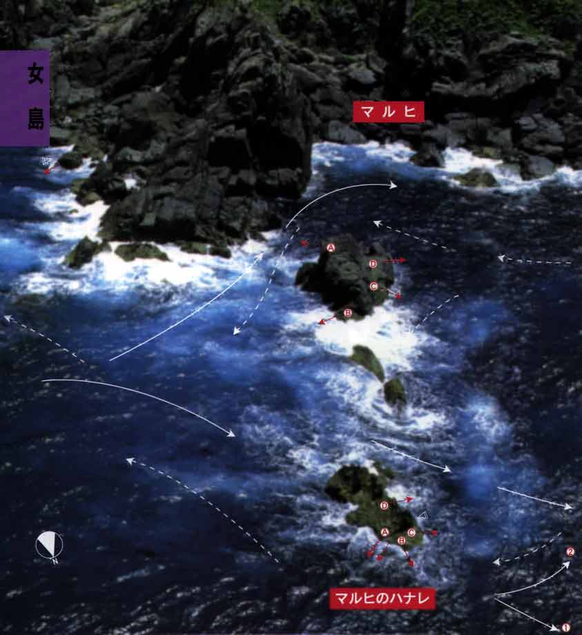 ■ハナレ 女島の北西部に位置する。ハナグリの瀬戸を西へ抜けた上げ潮は、ビョウブの位置までは反転して回り込んでくるが、このマルヒ付近ではかなり不安定な動きをする。したがって、ここでは一例を示しているに過ぎないことをお断りしておく。 地形的に北西の季節風にはきわめて弱いが、冬季のクチブトに関しては抜群の実績を誇る。その名のように、一部の釣り人の間だけで久しく隠されていたという。低く小さいので、波が出るとすぐかぶってしまう。