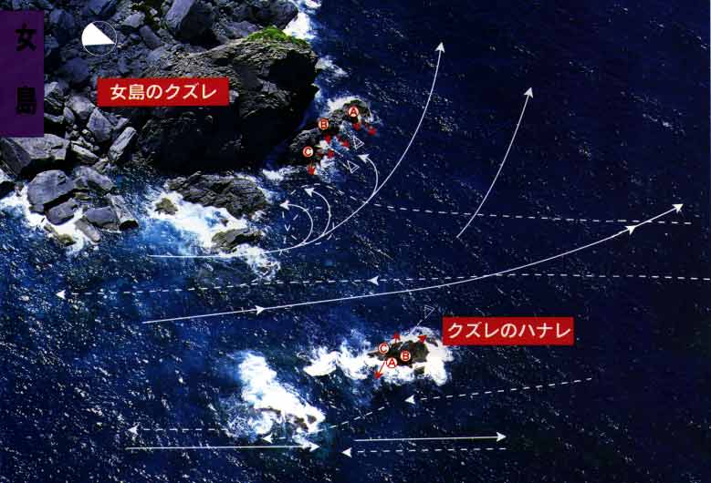 ■女島のクズレ 女島の北端にある地磯で、すぐ目の前にクズレのハナレが浮かんでいる。背後は崖が崩れているところからこの名が付いた。海中にも大石が無数に沈んでいるため、魚影は濃い。