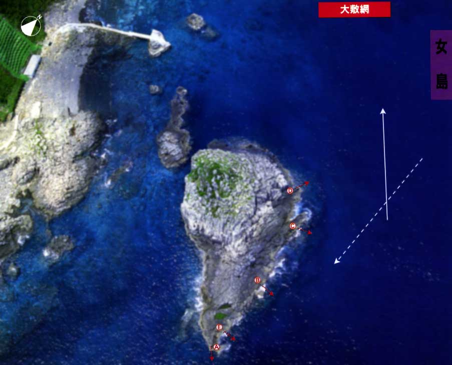 女島のほぼ中央東側に位置し、昔はその名のように大敷網が設置されていた。 瀬は大きく、キャッチボールができそうなほど広い。グループで夜間上礁するにはうってつけの所だ。 ただし、釣りに関しては実績が低く、人気もない。だから、いつ行ってもここは空いている。一つには潮通しがよくないせいもあろう。