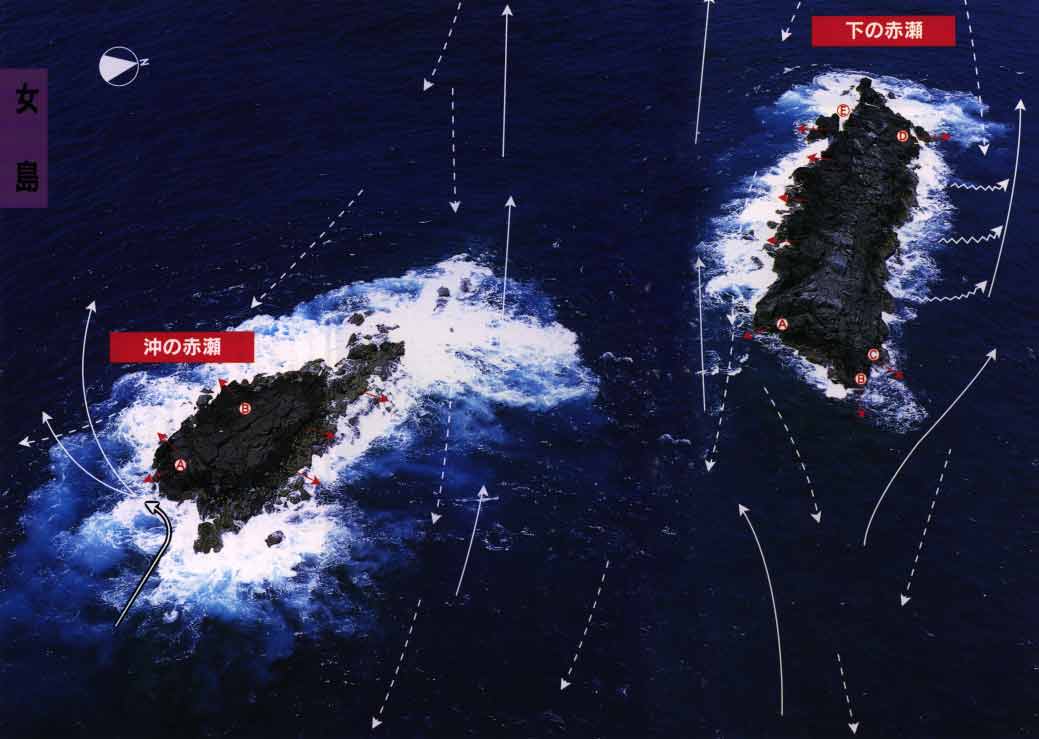 ・上物 下の赤瀬同様、女島本島の風裏に当たるため北風には強い。そのため、冬場のクチブトやオナガ、ヒラマサ釣りの人気は高い。Aからは、左から流れて来ていったん足元にぶつかり、ほぼ直角におれて右沖へ抜けて行く上げ潮に仕掛けを乗せる。 Bは下げのポイントになる。右後方から正面沖へ出て行くので釣りやすい。上げ潮ははるか沖を通るので釣りにならない。 これが条件に恵まれて、30〜50m沖までのびるサラシができたときは、上げ潮本流との合流点がポイントとなり、良型がヒットする可能性が高くなる。 水道側でもクチブトは出ないことはない。しかし、足場がややカケアガリ気味になっているため釣りづらく、加えて、ベタ凪のことが多いので確率としては今イチ。上げ潮にAでやれないときの予備のポイントとして覚えておけばよい。 こちらは上げ下げとも左右に流れる。ただし、這い上がってくる波には十分注意して欲しい。