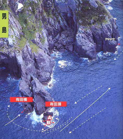 ■有田瀬 男島きってのクチジロ釣場として知られる。過去、9〜10kgクラスが数尾記録されており、大物志向のイシダイ釣師の間で人気は高い。男島の北東部に位置し、北西の季節風には弱い。足場も低いので波が出ると上がれなくなる。