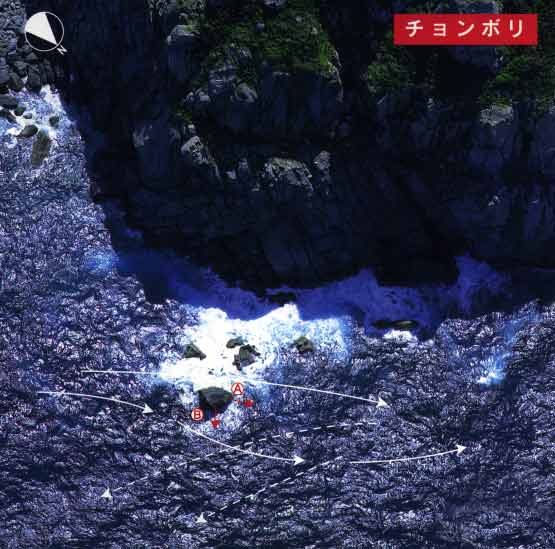 ・底物 イシダイは乗ッ込みの数釣りが望める。クチジロの実績はあまりない。Aは水深竿二本〜二本半。上げ潮の反転流を狙った方が確率は高い。足場は前下がりだが二人やれる。ただ、狭いので荷物は少なくしたい。 過去、このAで、32kgのクエが日中に上がっている。 下げ潮が緩いときは同じAからやれるが、速くなるとBから竿を出す。こちらは竿二本の水深がある。