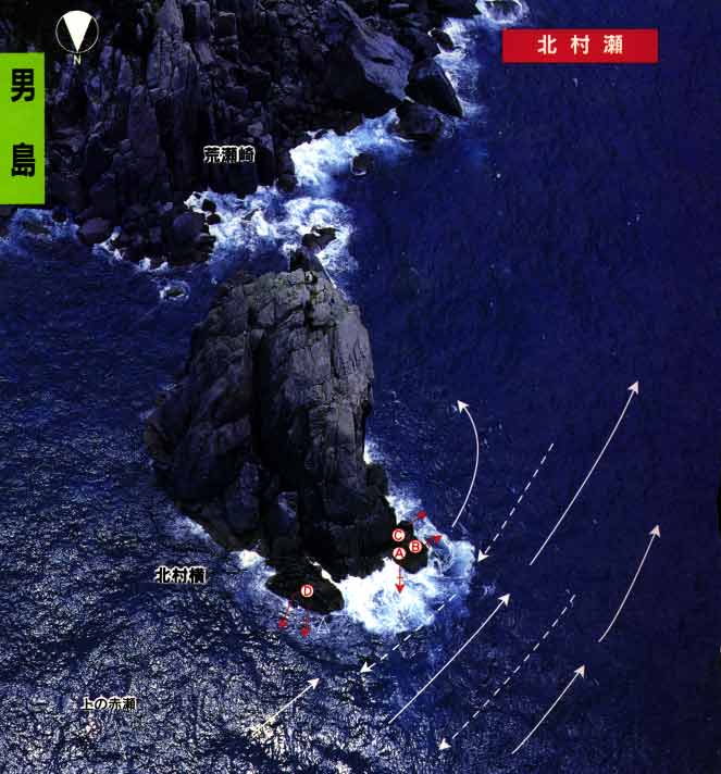 ・底物 この一帯は、下げ潮ははっきりした方向を示すが、上げ潮は安定してなく、時には上の赤瀬方向から入ってくることもある。 ノッ込み期のイシダイはコンスタントに上がっている。 Aは緩い上げ潮が正面から突っかけてくるときがチャンス。水深は竿二本半〜三本。足場はやや前下がりだが、問題はない。竿出し二人。 ここはクエの実績もある。やはり上げ潮が狙いだ。 Bは竿二本の水深で、左前方から来る下げ潮で一人竿が出せる。足場はよい。 Cは左前方から突っかけてくる下げ潮狙い。B同様、足場はいいが、狭いので一人しかやれない。 Dは北村横と呼ばれ、クチジロこそ実績はないが、大型のイシダイ(6.7kg)が上がっている。上げ潮で遠投する。下げでも当たりはでる。水深は竿二本〜三本。二人可能。 そのほか、写真では見えない裏側にも底物ポイントがある。こちらは上げ潮が本命になる。