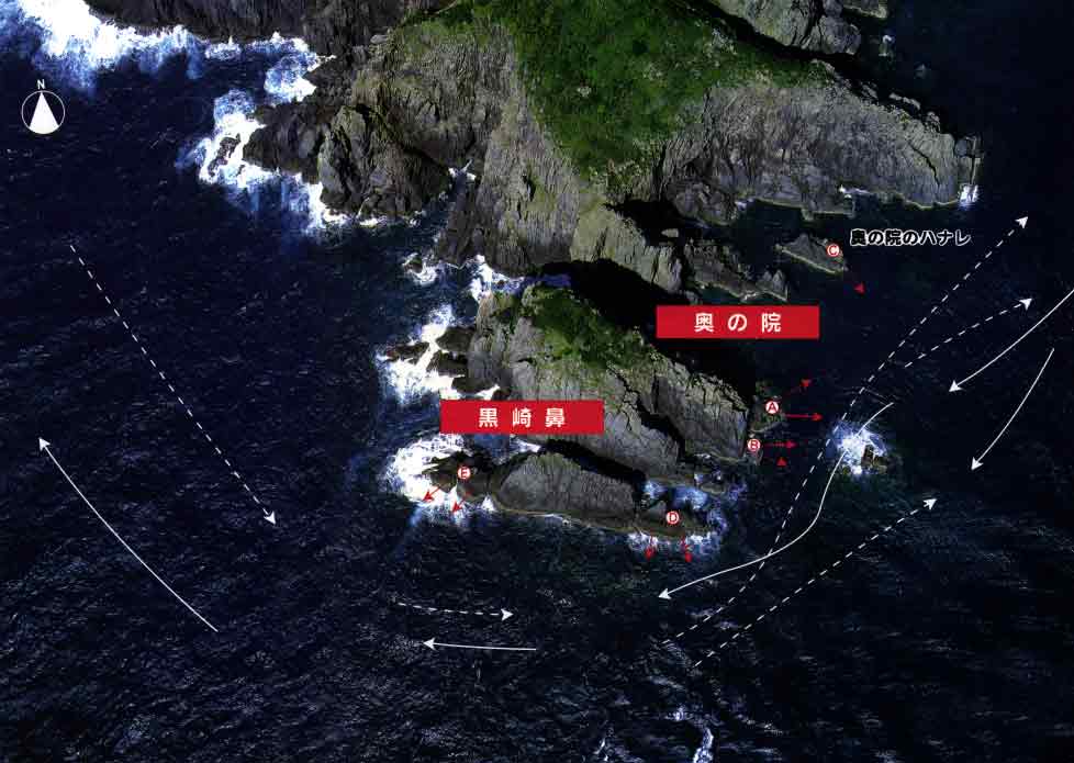 ■黒崎鼻 男島の南西端に位置し、馬込瀬戸に面した釣場が黒崎鼻である。航空写真では分かりにくいが、船から見ると奥の院同様そびえたつ奇岩の下に、釣場がひらけている。瀬戸に面しているだけに上げ下げともに速い潮が走るのが特徴である。また磯の周囲には根がはっているため、底物は釣りづらい。風がある時は、速い潮流の影響もあって波が這い上がりやすいので十分な注意が必要である。特に冬場は要注意。