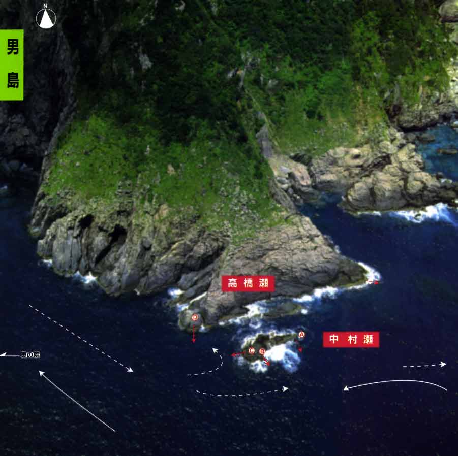 ■中村瀬 馬込瀬戸の東口に面しており、上げ下げともに潮切れがよく、上物底物ともに昔から人気のある釣場で、かつてはクエ、イシダイ、クチブトなどが平均してよく釣れていたが、近年はややムラ傾向なのが気掛かり。岩は広いが、高さがあまりないので風波に注意。特にウネリがある時の上昇には気をつけたい。