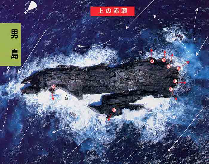 男島の北側沖、つまり男女群島で一番北に位置するのが上の赤瀬である。高く大きな独立礁で、風波にも強く、至るところから竿出しできるとあって人気は高い。クエを始め、クチジロ、イシダイ、クチブト、オナガと魚種も多彩で、とりわけクチジロは超大型が出るところとして有名である。