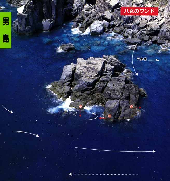 男島の東側に位置し、北西風の風裏になるため、冬場でも上礁できる日が多い。少し奥まったところにあるので、一見平凡な釣場に見えるが、上げ潮は比較的潮切れがよく、クチブト、オナガ、春のイシダイともに実績は高い。ただし、沖潮が強い時は潮切れはよくない。潮が小さい時が狙い目である。
