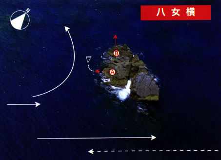 男島の東側に位置する小さな独立礁。左手に八女瀬、右手に八女のワンドを見る。北西風に強く、冬場でも上昇できる日が多い。磯の回りは沈み根や大きな石が多く、水深がさほどないので上物のみ。 これは男島東岸の磯に共通していえることだが、一般的に大潮回りでは沖潮が強く、手前は潮切れが悪いことがある。本島よりに浮かぶこの八女横も同様で、狙いは上げ潮が比較的よく切れる中潮から小潮まわりだといえよう。