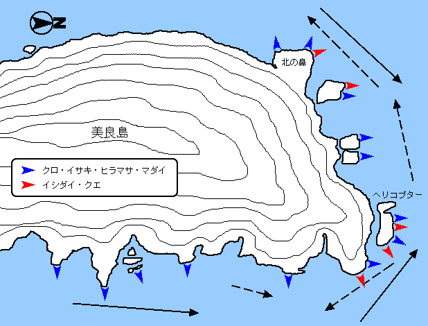 美良島の北側に面する北の鼻は10月から12月にかけて超大型のヒラマサが回遊してくる。足場がいいため1メーターを超えるヒラマサが何本も仕留められている。