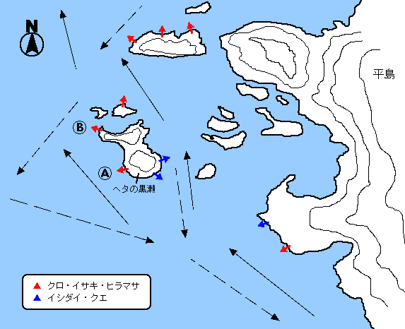 冬場の1月から5月にかけてBポイントではクロの良型が数多く当たってくる。Aポイントでは11月・12月頃には大型ヒラマサが頻繁に回遊してくる。石鯛は平島本島向きで水深は浅いが数つりが楽しめる。
