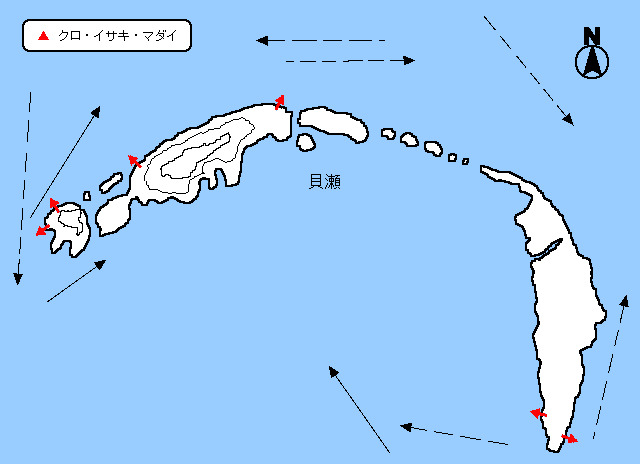磯が非常に低いので上がれる機会が少ない。上礁してしまえば魚影は濃い。南東側の釣り場では満潮時は水没してしまう。クロは瀬全体に良くつれ40センチオーバーは間違いない。秋にはヒラマサが回遊してくる。